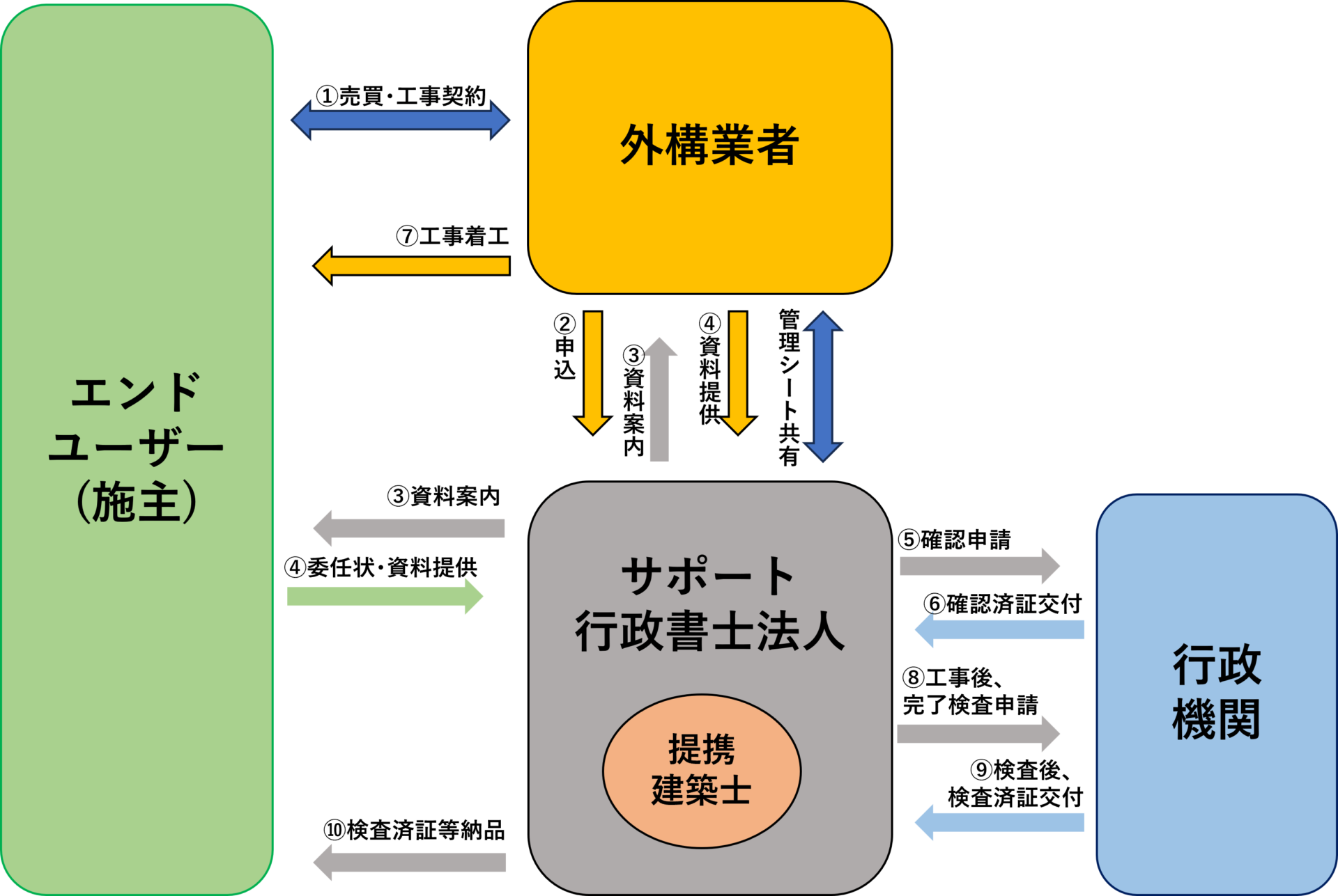 カーポートを扱う大手の家電量販店・ハウスメーカー・リフォーム会社・住宅用設備機器メーカー等では、多くの顧客から建築確認申請の相談・申請の代行依頼を受けることとなります。