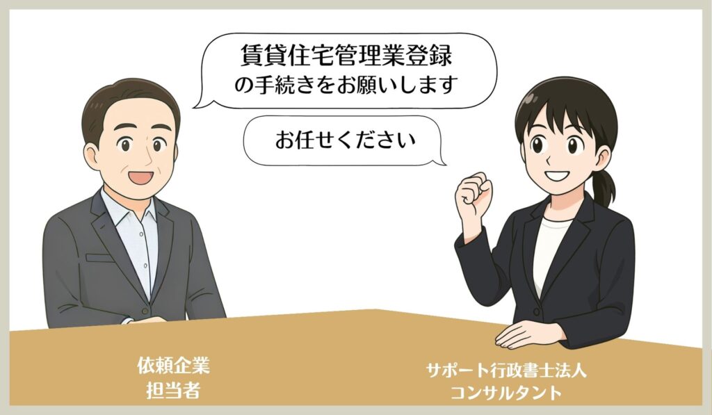 サポート行政書士法人では、新規登録から既存賃貸住宅管理業者の皆さまに対して、賃貸住宅管理業法に基づく申請サポートやコンサルティングを行っています。
