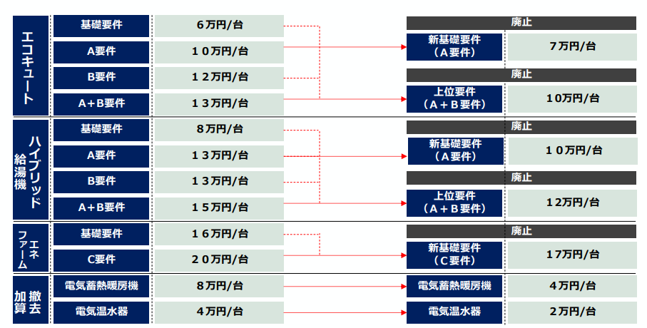 補助額は引き下げることにより、支援台数の増加を目指しています。(より「高機能製品DR機能を具備した機器(A要件、C要件)」や、「更に省エネ性能の⾼い機器(A+B要件)」)へのシフト)