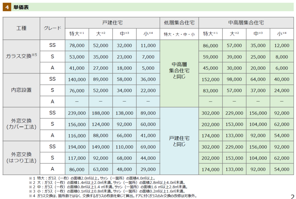 - 高断熱窓(熱貫流率Uw1.9以下等、建材トップランナー制度2030年目標水準値を超えるもの、その他要件を満たすもの等)への断熱改修工事