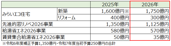 ※今年度実施している「子育てグリーン住宅支援事業」は、「基礎工事より後の工程の工事」を対象でしたが、「みらいエコ住宅2026事業」においては、「基礎工事」に変更されている点にご注意ください。