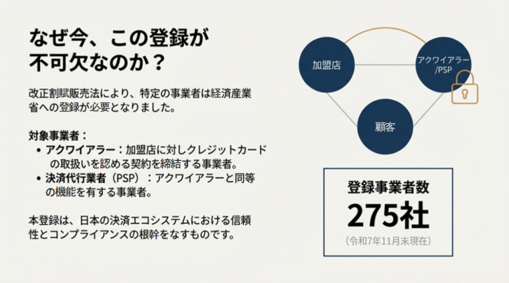 日本の決済エコシステムへ参入し、加盟店契約を締結するためには、改正割賦販売法に基づく経済産業省への登録が不可欠です。