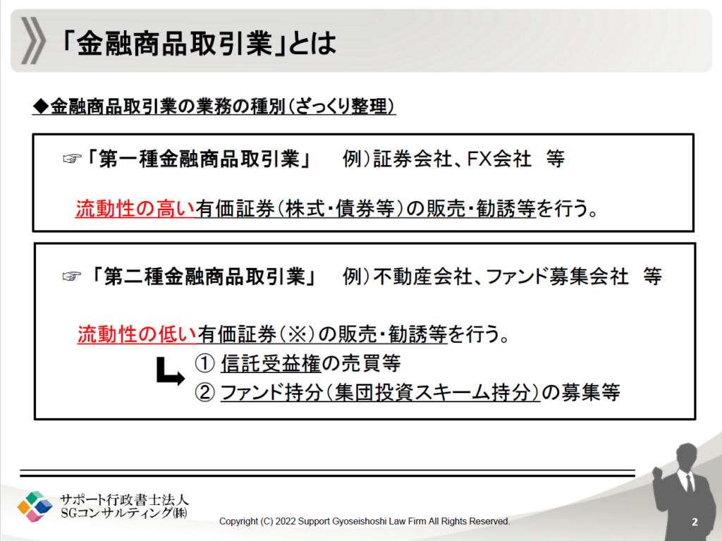 金融商品取引業は、その業務内容に応じて複数の種別に区分され、