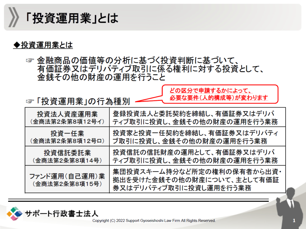 本資料は、投資運用業に関する許認可支援を行ってきた行政書士法人が、