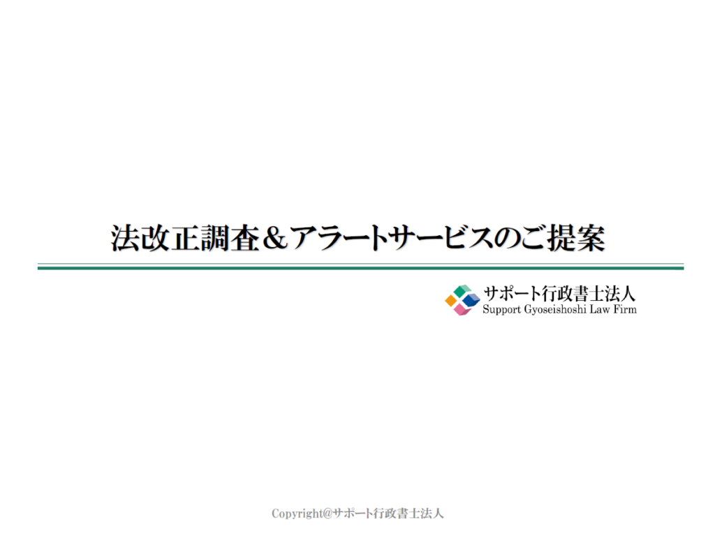 法規制・許認可対応をまとめて外部委託できる「許認可一括管理」や、関係法令の改正情報をタイムリーにお届けする「法改正アラート」など、弊社の各種支援メニューを一冊にまとめました。