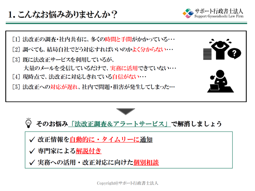 貴社の業務や保有許認可に応じて必要な法令を選定し、改正内容を専門家の解説付きでタイムリーにお届けする仕組みや、実務への落とし込みを支援するサポート内容をご紹介しています。