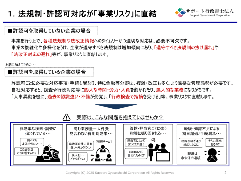 許認可の更新・変更手続きの漏れを防ぎたい企業様や、コンプライアンス体制の強化・業務効率化を検討されている担当者様にぜひご覧いただきたい資料です。