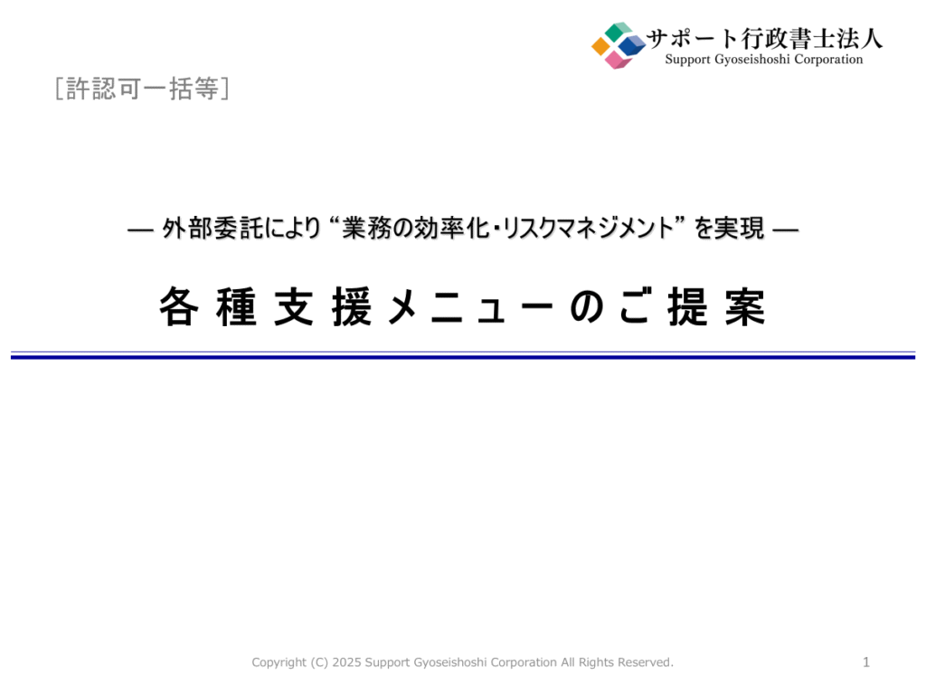 法規制・許認可対応をまとめて外部委託できる「許認可一括管理」や、関係法令の改正情報をタイムリーにお届けする「法改正アラート」など、弊社の各種支援メニューを一冊にまとめました。