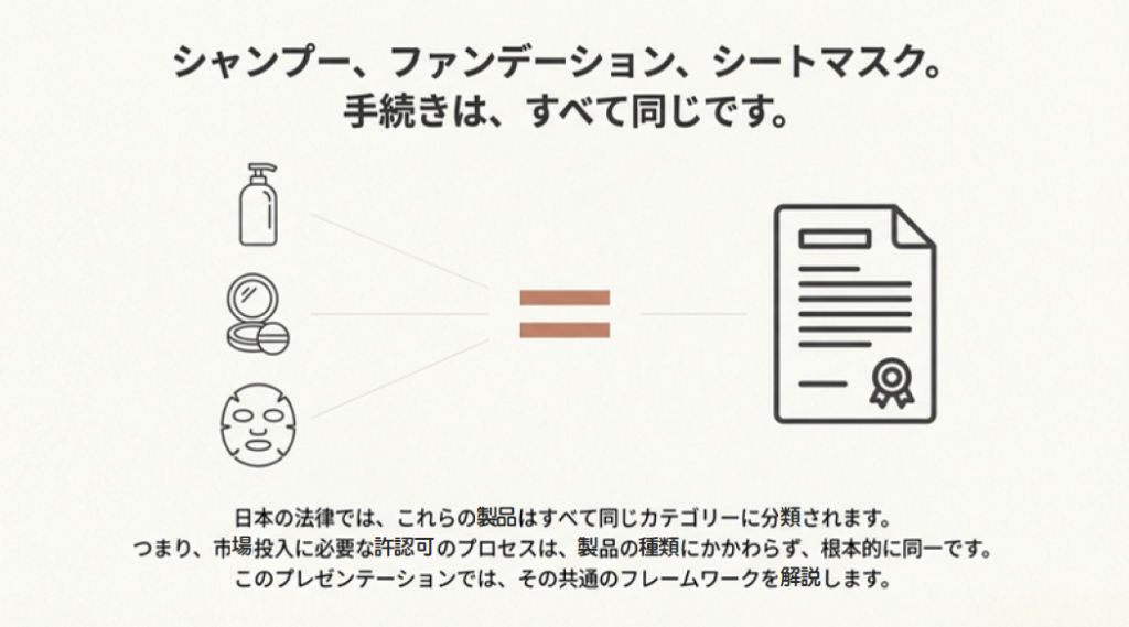 - 意外な対象製品:石鹸、バスソルト、シートマスクなど、すべて共通の手続きが必要な「化粧品」の定義。