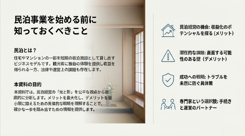 - 直面する可能性のある壁:年間180日の営業上限、近隣住民とのトラブル、多岐にわたる管理業務。